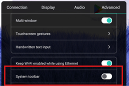 - Navigate to Advanced, scroll down and toggle OFF System Toolbar.