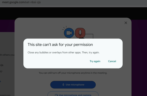 Solution: If you've already allowed permissions for the Chrome application to access the Microphone and Camera via Application permissions, then you'll need to allow it for site settings as well. The applications that have bubble/overlays are being blocked by Android Security.