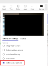 Once enabled, devices can now be selected through conferencing apps under Instashare 2 Camera/Microphone.