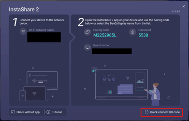 Users with the Instashare 2 Application on their devices can now scan a QR Code to instantly connect to the BenQ Board. Casting device will join the network through Instashare 2 (BenQ Board must be connected to Wi-Fi), allowing it connect to the board.