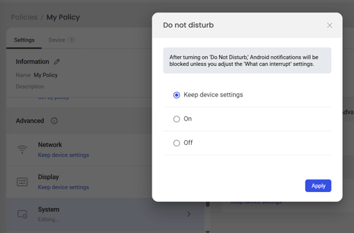 Policies → [Policy] → System → Do Not Disturb.