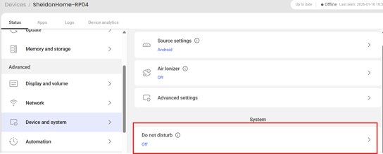 Devices → [Device] → View details → Status → Device and system → Do Not Disturb.