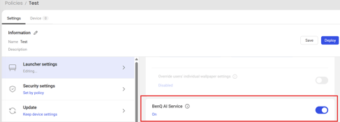 Policies → [Policy] → Launcher settings → BenQ AI Service