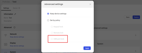 Policies → [Policy] → System → Advanced settings → USB port lock.