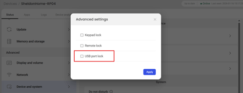 Devices → [Device] → Device and system → Advanced settings → USB port lock.
