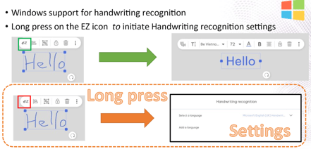 Users can now use Handwriting recognition in the Windows version of EZWrite 6. Users can long-press the Handwriting recognition button to access the Handwriting recognition settings.